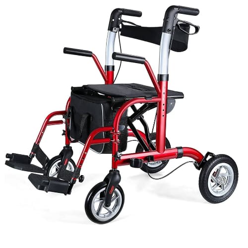 This versatile hybrid model serves as both a traditional rolling walker and a transport wheelchair, featuring detachable footrests and a reversible backrest for moments when the user needs to be pushed.